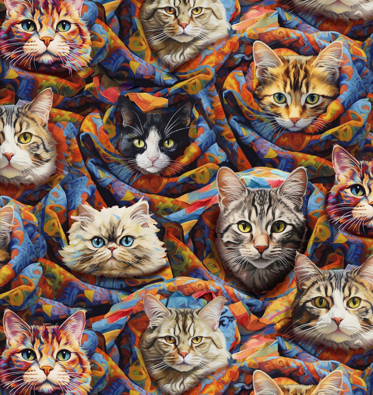 Auf einem lebendigen Hintergrund aus dynamischem, ineinanderfließendem Stoff präsentieren sich detailreiche Porträts verschiedenster Katzen. Von majestätischen Maine Coons über elegante Siamkatzen bis hin zu verspielten Tabby-Katzen – jede einzelne Samtpfote wurde mit viel Liebe zum Detail eingefangen und erweckt den Stoff zum Leben.