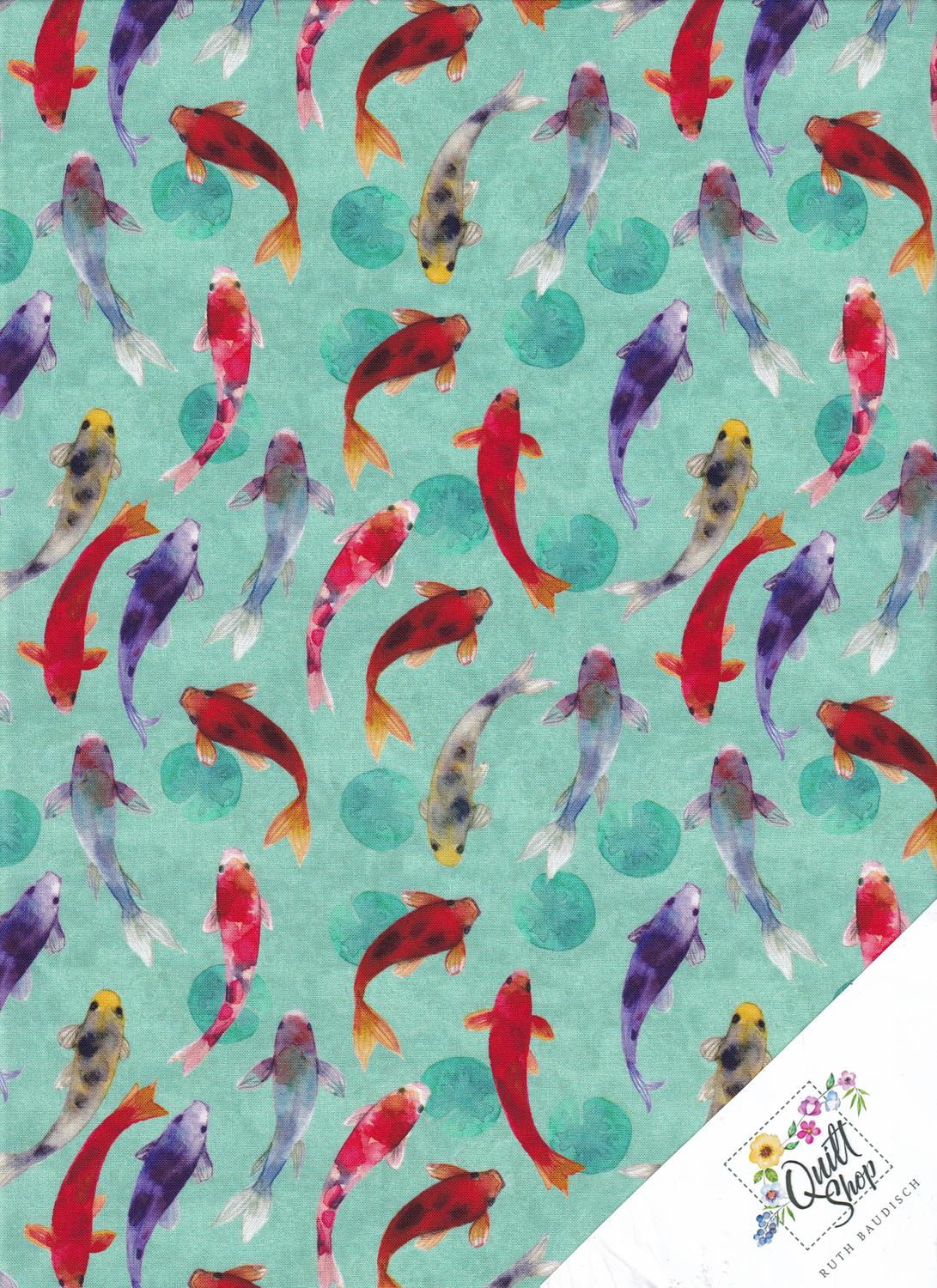 Bringen Sie mit diesem bedruckten traumhaften Koi-Stoff aus 100% Baumwolle Ruhe und Eleganz in Ihre nächsten Nähprojekte. Das Design besticht durch seine sanften Wasserfarben-Nuancen und die dynamische Anordnung der Fische, die wirken, als würden sie direkt über den Stoff gleiten.