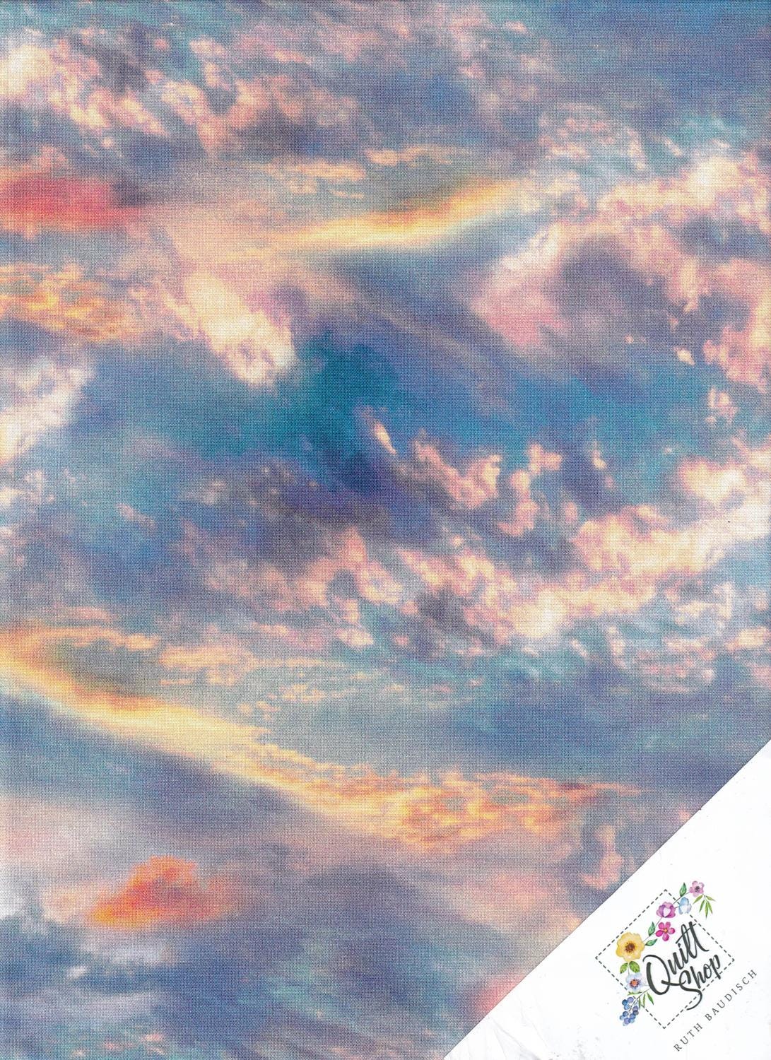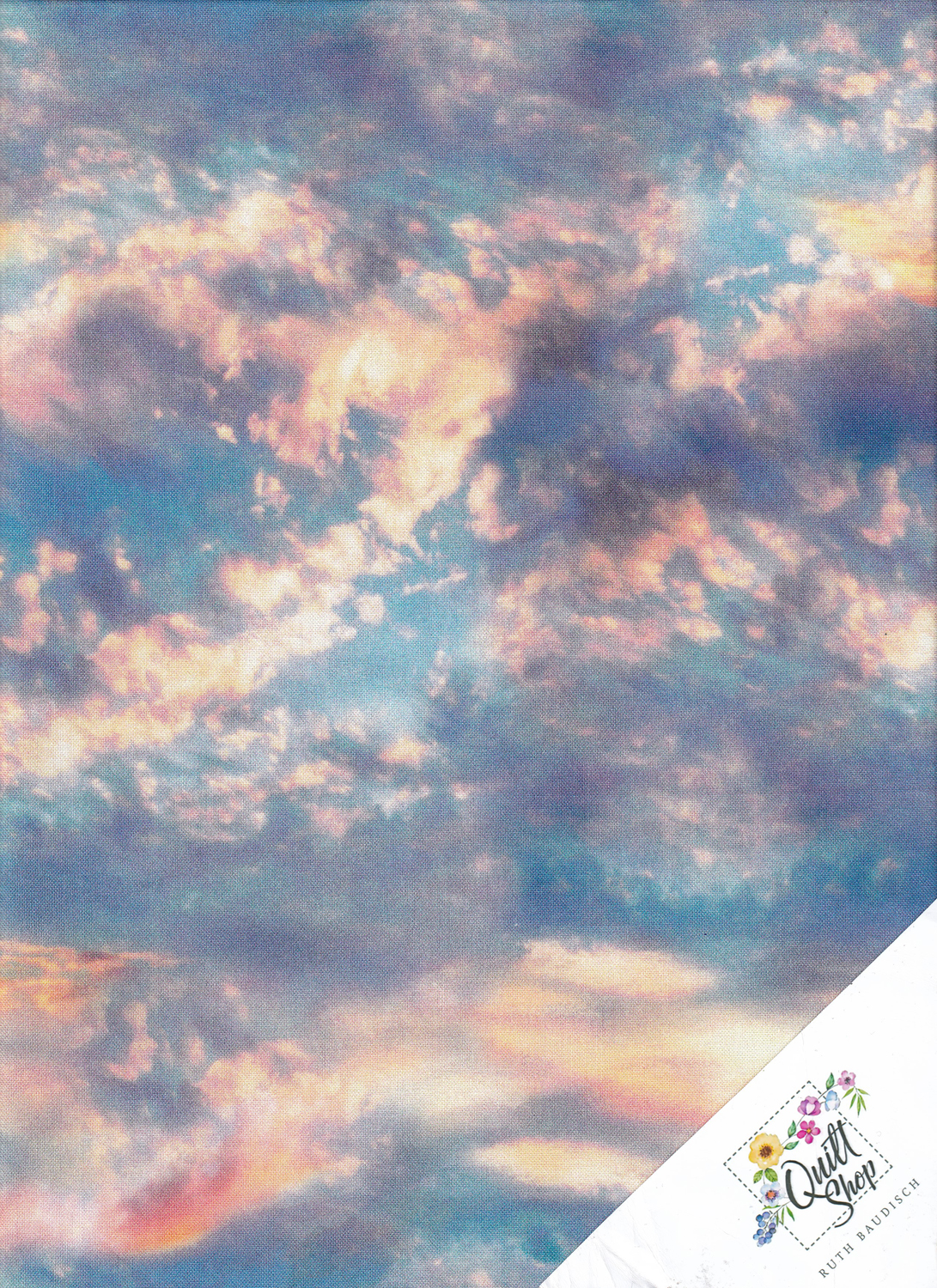 Dieser bedruckte 100% Baumwollstoff fängt die magische Stimmung eines dramatischen Abendhimmels ein. Mit seinem fließenden Übergang von tiefem Indigo und Violett zu leuchtenden Akzenten in Gold, Apricot und sanftem Rosa wirkt das Motiv wie direkt auf die Leinwand gemalt. Die detailreiche Struktur des Wolkenspiels verleiht Ihren Projekten eine unglaubliche Tiefe und Dynamik.