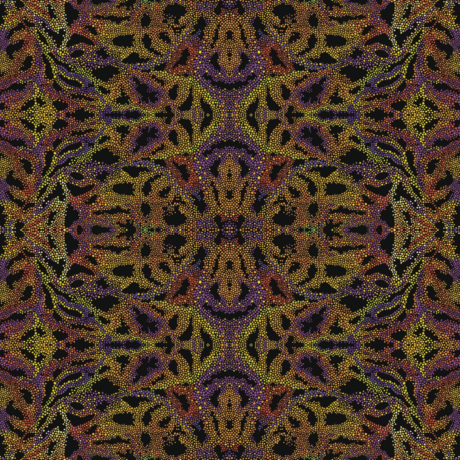 Dieser faszinierende, bedruckte Patchworkstoff aus 100% Baumwolle entfaltet eine warme und vielschichtige Farbpalette auf tiefschwarzem Grund. Feinste Punkte in leuchtendem Gelb, sattem Orange und tiefem Violett verschmelzen zu einem komplexen und organisch anmutenden Muster.